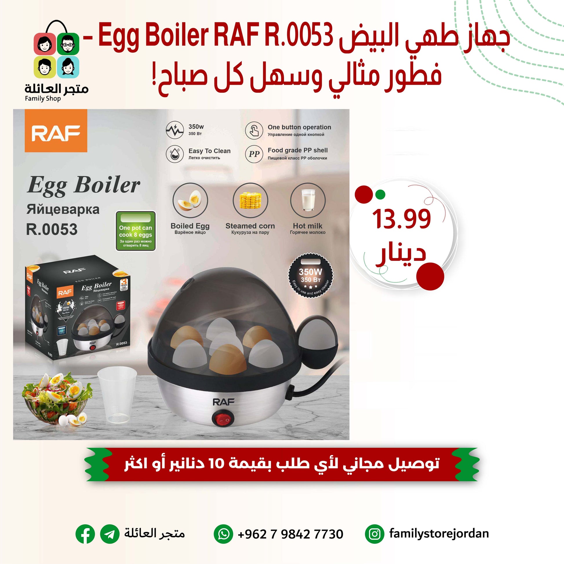 لماذا تختارونه من متجر العائلة؟ جهاز طهي البيض RAF R.0053 هو استثمار صغير ولكنه ذو قيمة كبيرة لأي مطبخ. إنه يوفر لكم طريقة صحية ومريحة لتحضير البيض في دقائق معدودة، مما يجعله مثاليًا لنمط الحياة السريع. احصلوا عليه الآن من "متجر العائلة" واستمتعوا بفطور مثالي كل صباح!