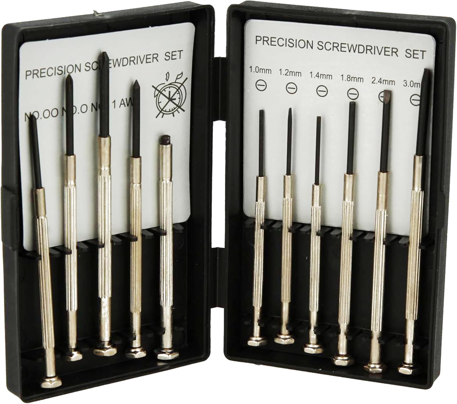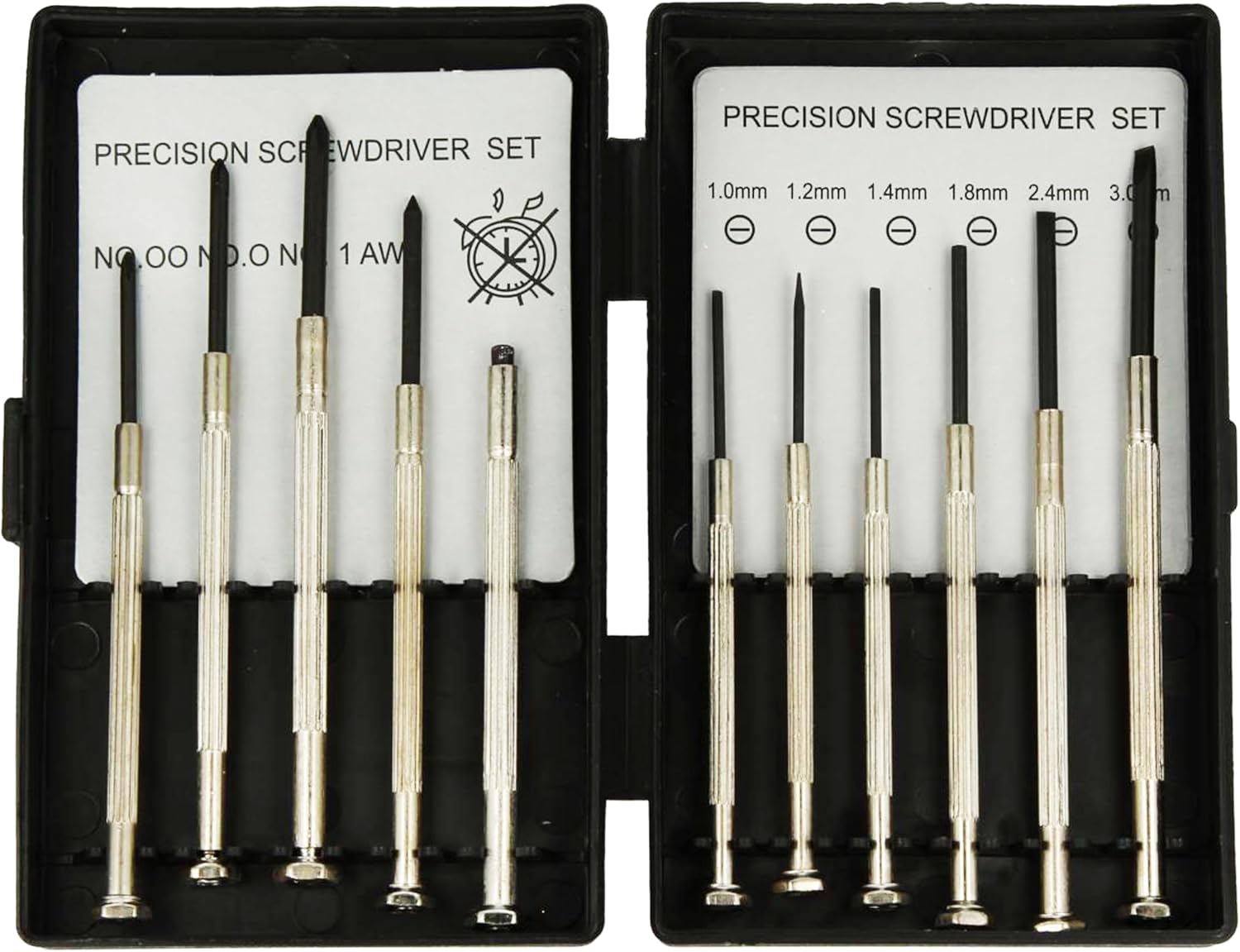 مجموعة مفكات براغي دقيقة مكونة من 11 قطعة تتميز بجودة احترافية تتضمن رقم 00، رقم 0، رقم 1، 0.9، 1.2، 1.4، 1.8، 2.4، 3.0، مخرز ومغناطيس مع حقيبة حمل بلاستيكية