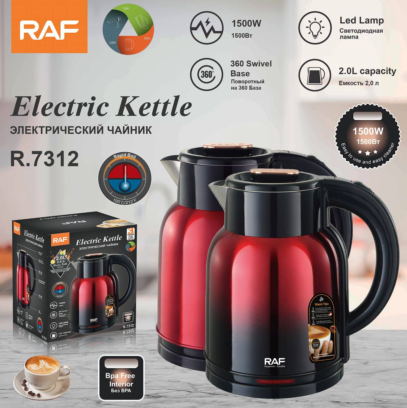 توفر لكم غليانًا سريعًا للماء مع ميزات أمان متقدمة لضمان راحة البال. سواء كنتم تحضرون الشاي، القهوة، أو أي مشروب آخر، فإن RAF R.7312 توفر الكفاءة والسرعة التي تحتاجونها.