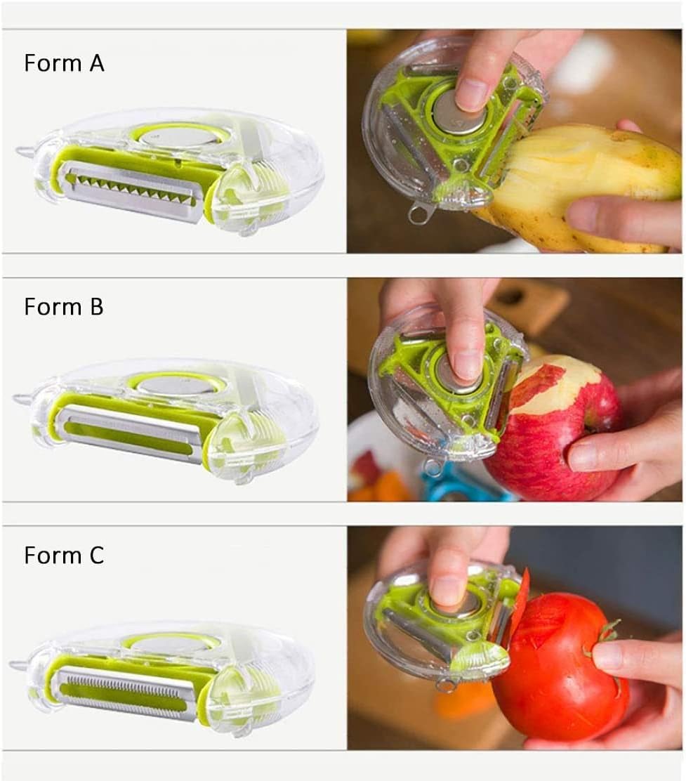 مقشرات من الفولاذ المقاوم للصدأ 3 في 1 - مقشرة المطبخ مصممة مع 3 شفرات مختلفة. الشفرة المستقيمة مناسبة للشرائح الصلبة مثل البطاطا والتفاح والكمثرى. الشفرة المسننة تجعل تقشير الفاكهة الناعمة بشكل فعال مثل الطماطم والمانجو والكيويفروت.