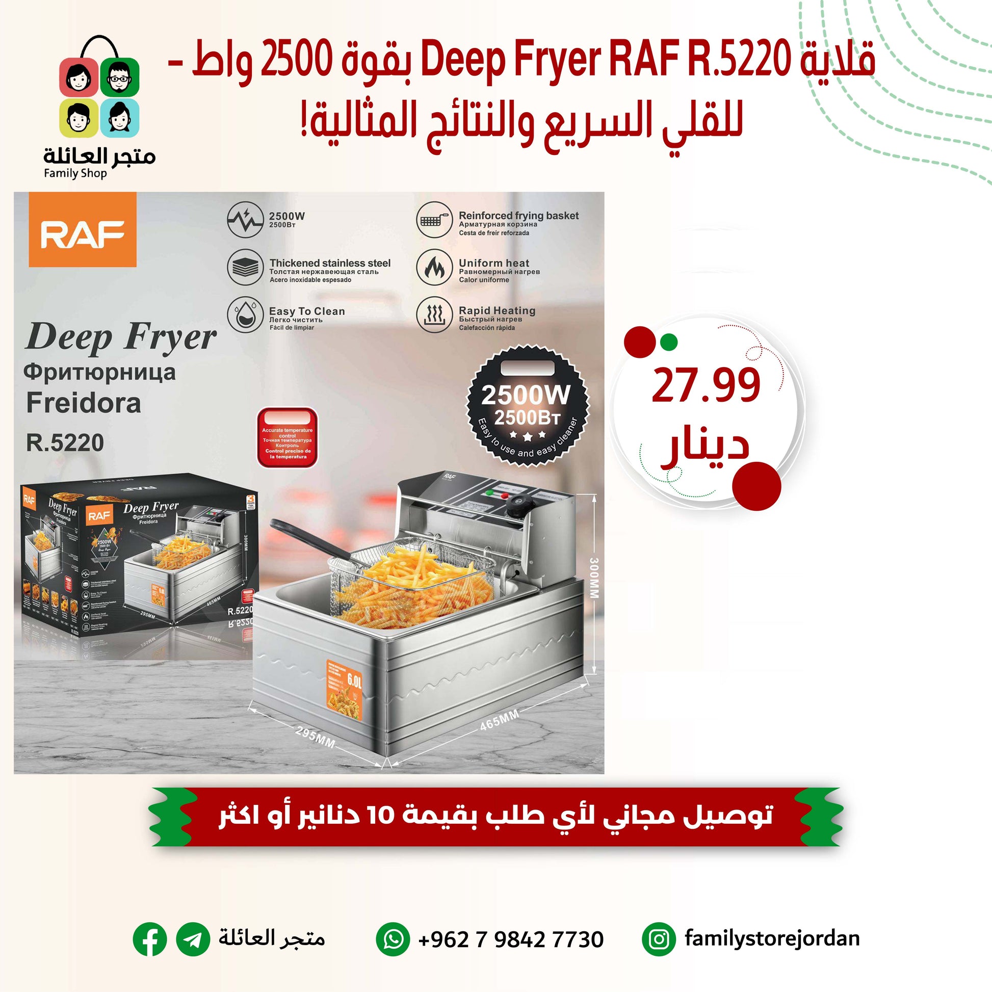 لماذا تختارونها من متجر العائلة؟ قلاية Deep Fryer RAF R.5220 هي إضافة لا غنى عنها لأي مطبخ يرغب في تحضير الأطعمة المقلية اللذيذة بسهولة وأمان. احصلوا عليها الآن من "متجر العائلة" واستمتعوا بتجربة قلي احترافية في منزلكم!