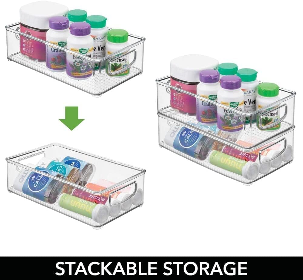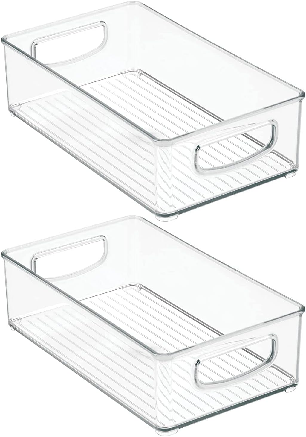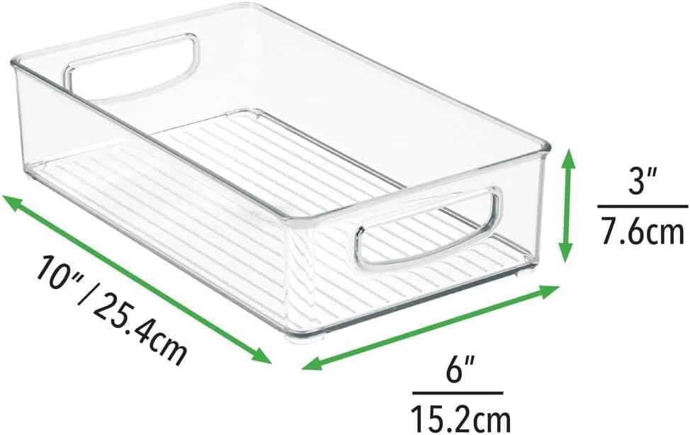 سلة التخزين الشفافة القابلة للتكديس سلة تنظيم للثلاجة، يبلغ قياسها 10 بوصات طولاً × 6 بوصات عرضًا × 3 بوصات ارتفاعًا. الحجم المثالي ليناسب الفواكه والخضروات والزبادي والسلع المعلبة وحزم الطعام والجبن واللحوم، كما أنها جيدة لتخزين السلع الجافة في المخزن.