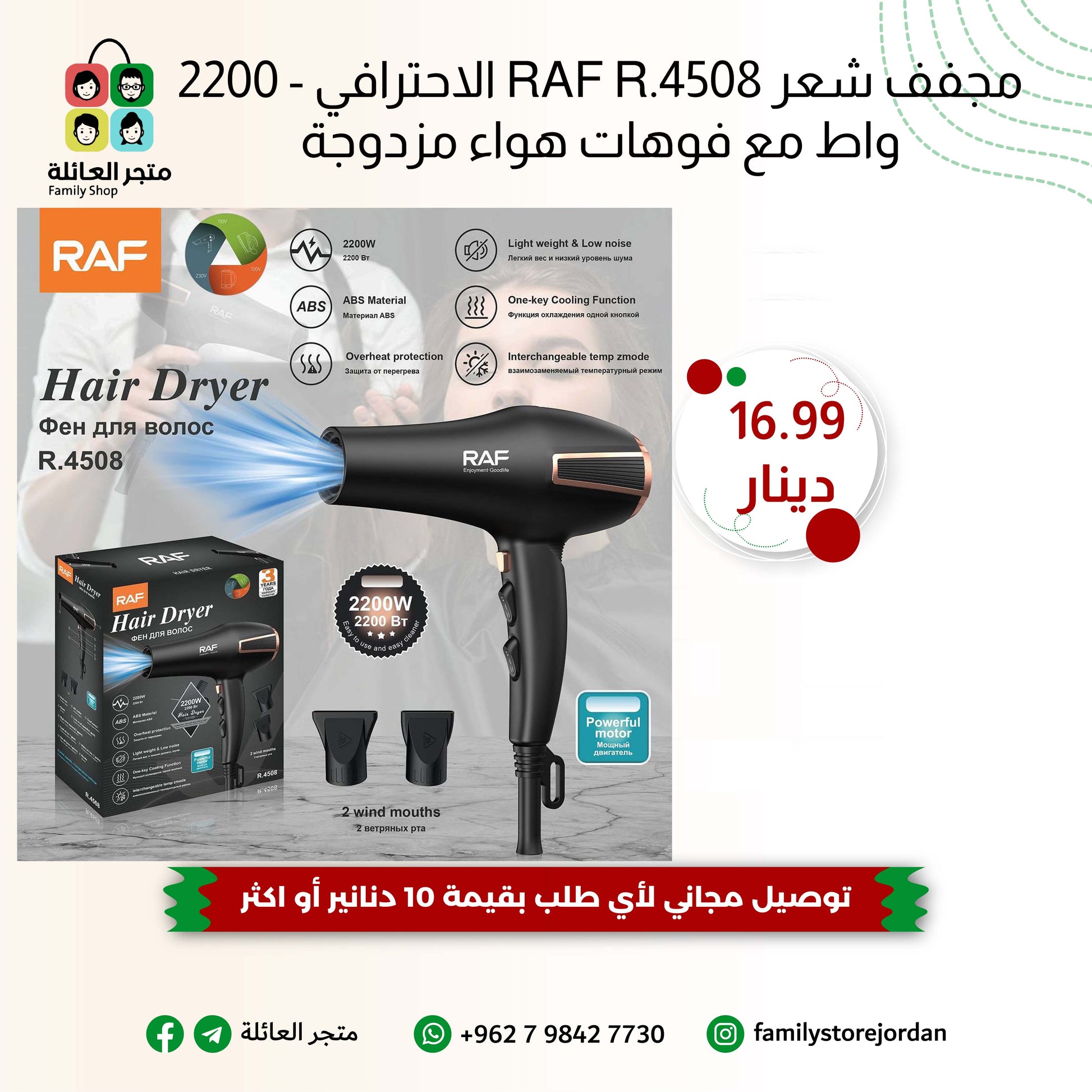 في "متجر العائلة"، نختار لكم أفضل المنتجات التي تجمع بين الجودة العالية والأداء الفعال. مجفف الشعر RAF R.4508 هو الخيار الأمثل لمن يبحث عن جهاز موثوق وقوي لتصفيف شعره اليومي بكل سهولة واحترافية. اطلبوه الآن واستمتعوا بشعر صحي ولامع!