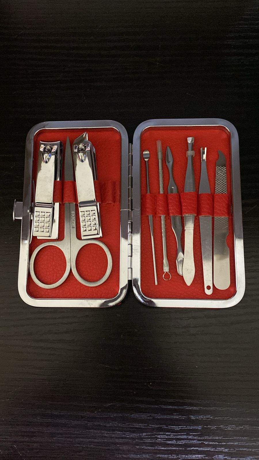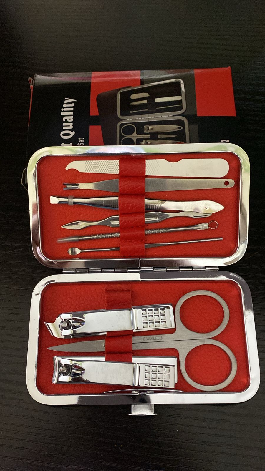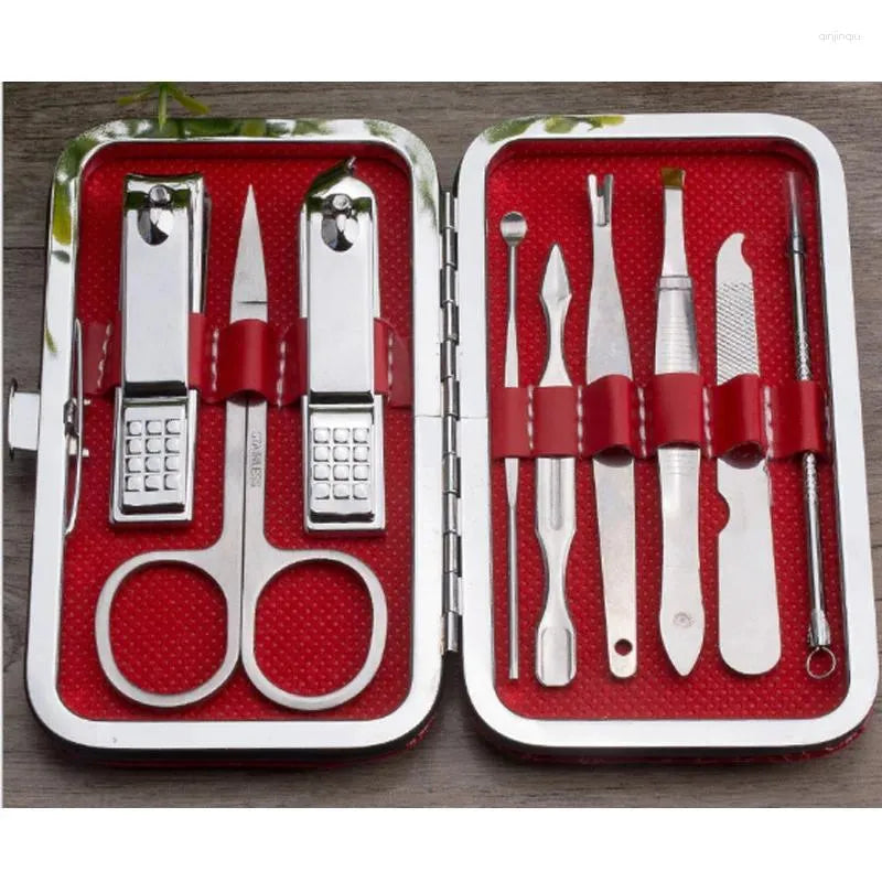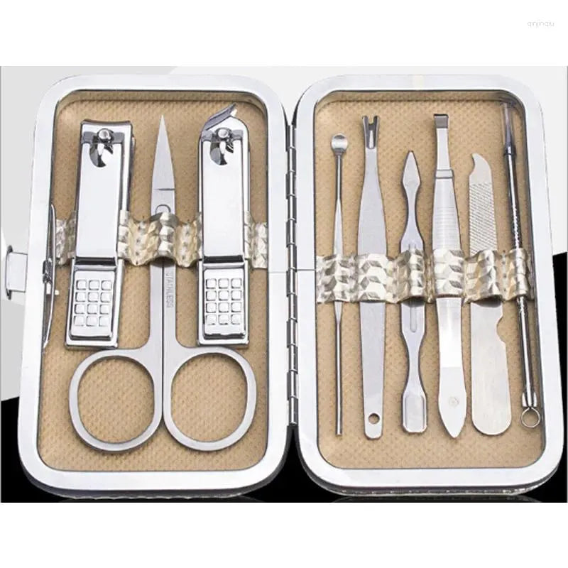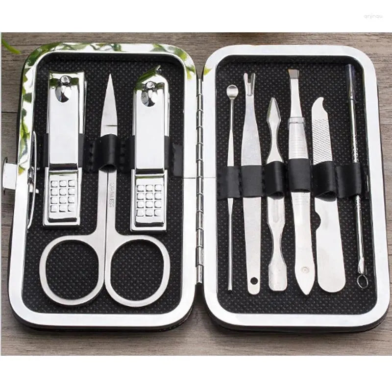 مجموعة أدوات للمانيكير والباديكير، مجموعة مكونة من 9 أدوات فولاذية، بعضها يجمع عدة وظائف: - مقص للبشرة - مقص أظافر كبير - مقص أظافر بزاوية - ملقط حواجب - إبرة مضادة لحب الشباب - إبرة للبشرة - أداة مضادة البشرة - ملف الأظافر