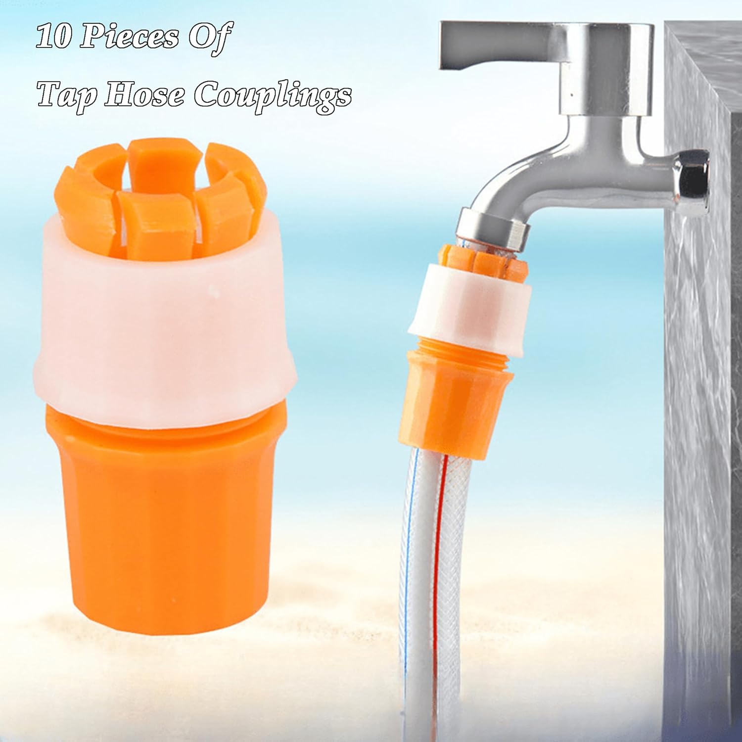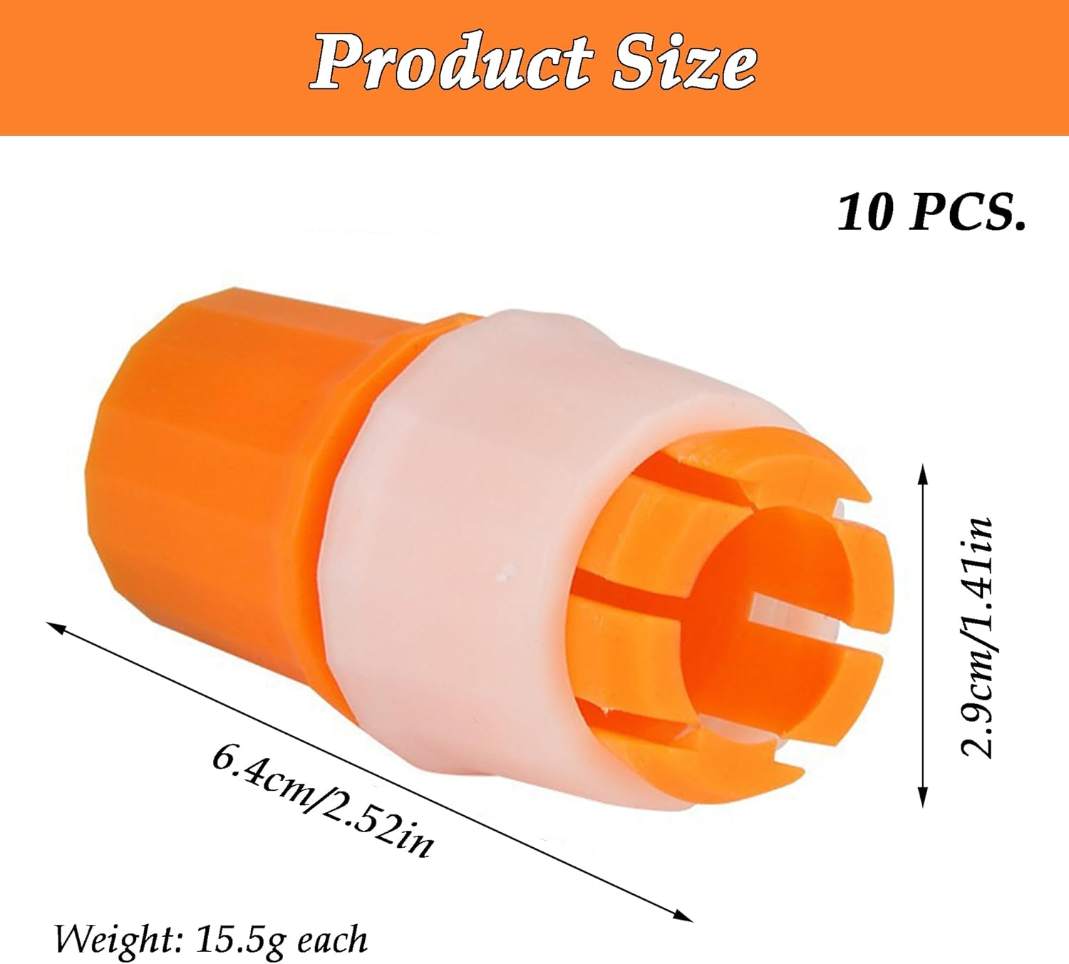 محتويات العبوة: ستحصل على ١٠ موصلات خراطيم حدائق برتقالية، مقاس ٢٩ × ٦٤ مم، وزنها حوالي ١٥.٥ جم، مناسبة للقطر الداخلي ١٦ مم والقطر الخارجي ١٩ مم. كمية كافية لتلبية احتياجاتك. هذا يُساعد على إنشاء نظام إمداد مياه للمنزل أو الحديقة أو حتى حقل صغير.