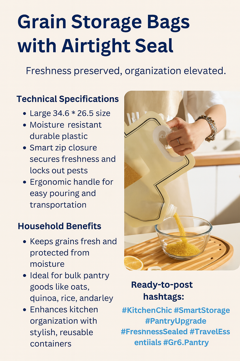 🔹 "لأن النقاء يستحق الحفاظ عليه، هذه الأكياس تمنحك تخزينًا ذكيًا ومظهرًا جذابًا. حماية لرزك، وشياكة لأرفف مطبخك."