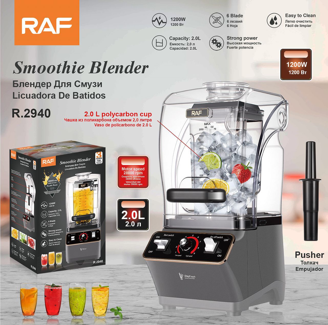 RAF R.2940 – خلاط سموذي احترافي بقدرة 1200 واط وسعة 2 لتر