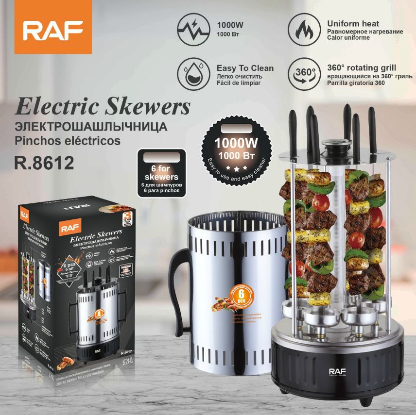 🛒 RAF R.8612 – شواية كهربائية متعددة الأسياخ ودوران ذكي وصف مختصر: قدرة 1000 واط، دوران 360°، حرارة موحدة، سهلة التنظيف، 6 أسياخ، مثالية للشواء المنزلي.