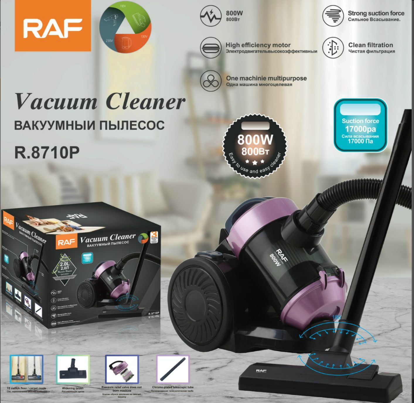 🛒 RAF R.8710P – مكنسة كهربائية عالية الكفاءة ومتعددة الاستخدامات وصف مختصر: قدرة 800 واط، قوة شفط 17000 باسكال، ترشيح بنسبة 99.97%، تصميم أنيق، سهلة التنظيف، مثالية لكل المساحات.
