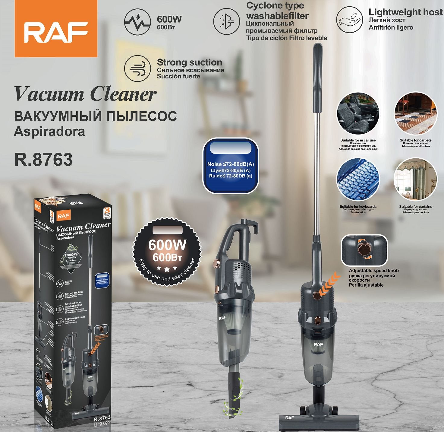 RAF R.8763 – مكنسة كهربائية محمولة وعامودية بتقنية الأعاصير وفلتر HEPA